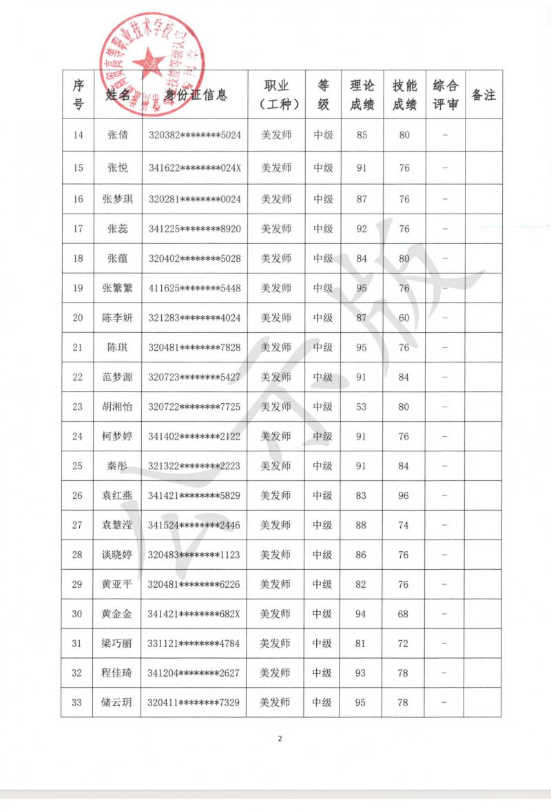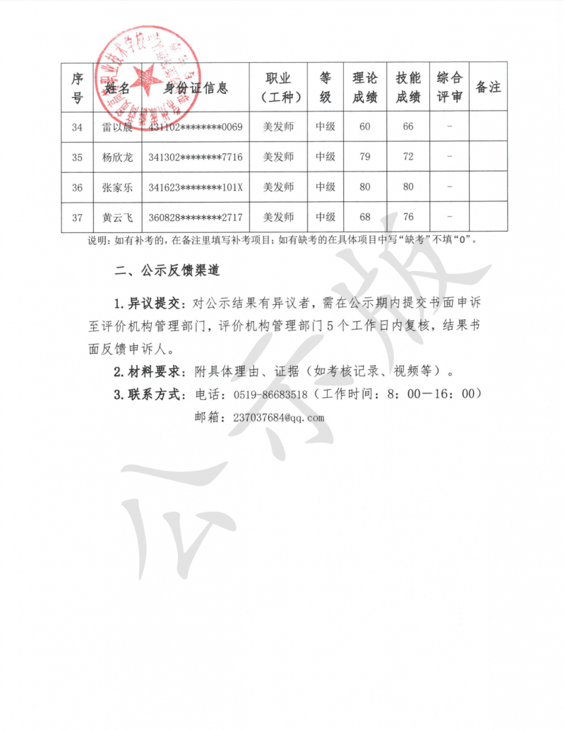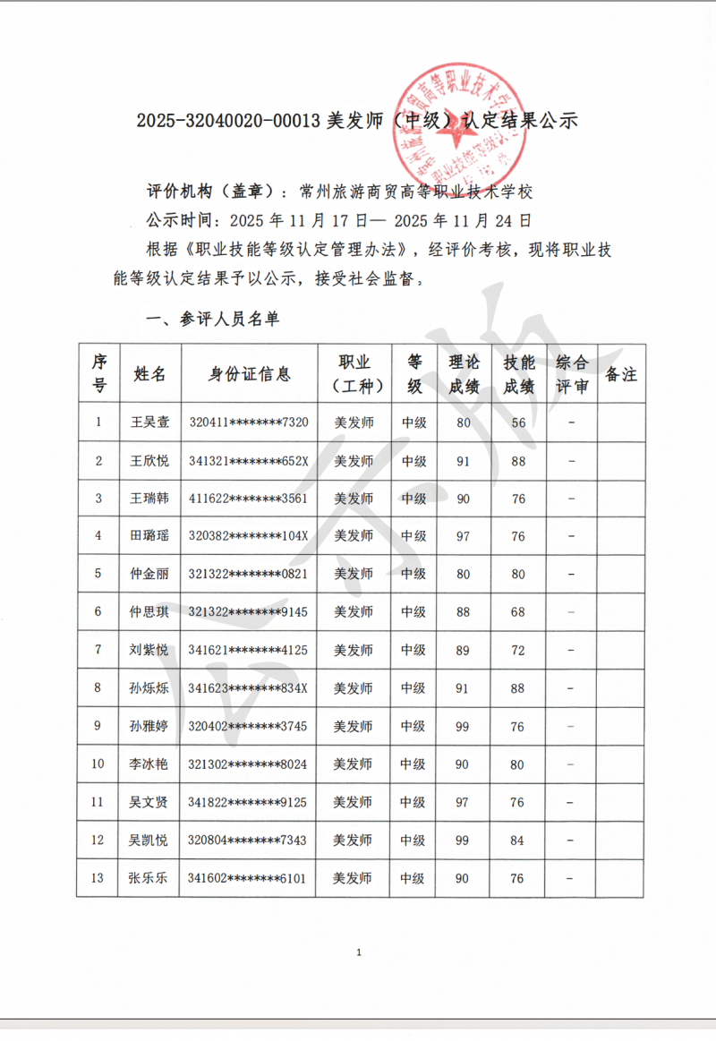 2025-32040020-00013美发师 (中级) 认定结果公示