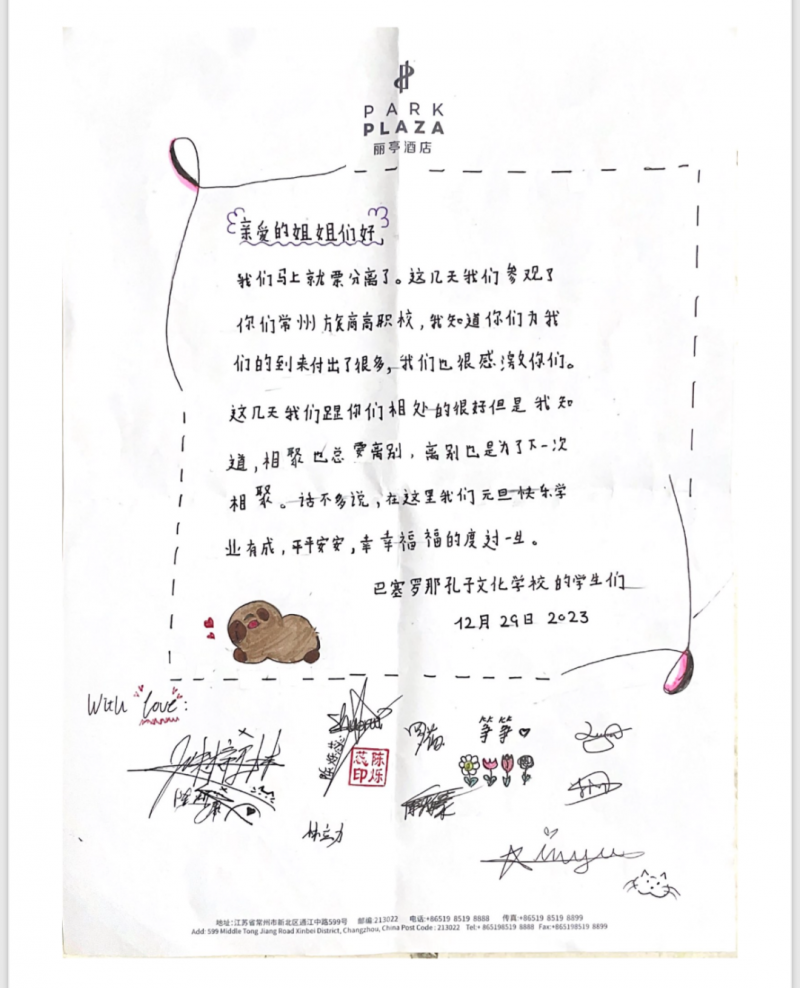 短短三天的常州行,学校精心筹划了舞龙舞狮、中华武术、京剧脸谱、中国茶艺、金坛刻纸、中医等中华传统文化课程,以及常州大麻糕、酸菜鱼、包饺子等中国美食文化制作课程,安排了一场与旅商师生一道迎接新年的文化嘉年华活动,还带领营员们前往青果巷、中华恐龙园、淹城春秋乐园等外出探访活动,以此近距离感受常州深厚的历史文化底蕴和充满活力的现代时尚气息。此次常州站活动受到了华裔师生的高度评价,离开常州前,陪伴了营员们三天的来自应用外语系的志愿者同学们收到了来自巴塞罗那孔子文化学校孩子们亲手写的信,表达感谢与不舍。跟拍三天的创意信息系师生摄影团队也收到了感谢小礼物。时间虽短,却建立了深厚的友谊。