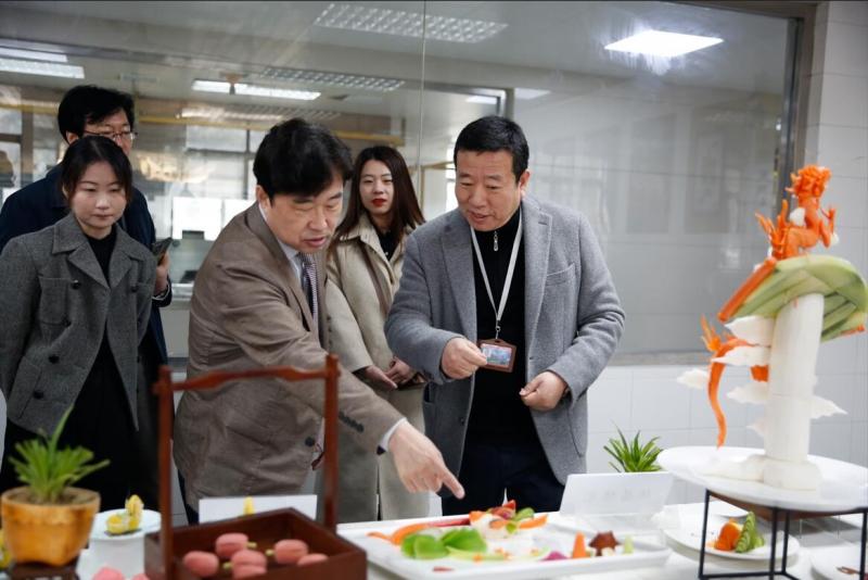 王校长带领代表团一行分别参观了我校季子楼、霞客楼、宣怀楼、国际友谊林、如境书院等场所,对学校基本情况、专业特色、办学成果等进行了一一介绍,代表团实地参观了学生技能实训课堂,在烹饪实训室,代表团对学生食物雕刻、面点等作品啧啧称赞,还品尝了西点烘焙专业学生制作的甜点。参观结束之际,双方在马踏飞燕前合影,并期待未来有机会开展合作交流。