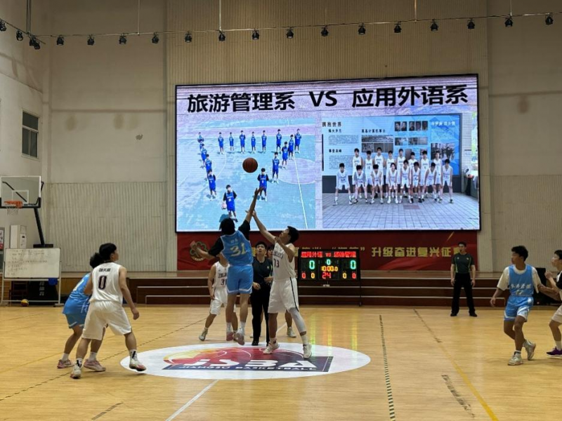 本次篮球联赛的揭幕战是由旅游管理系对战应用外语系。双方秉持友谊第一的原则在赛前互相致意。随着裁判吹响哨声,扣人心弦的揭幕战正式开打。比赛中,双方球员各施绝技,每球必争,三分、跳投、盖帽等精彩表演将现场氛围推向了高潮。最终旅游管理系以48:19战胜应用外语系。
