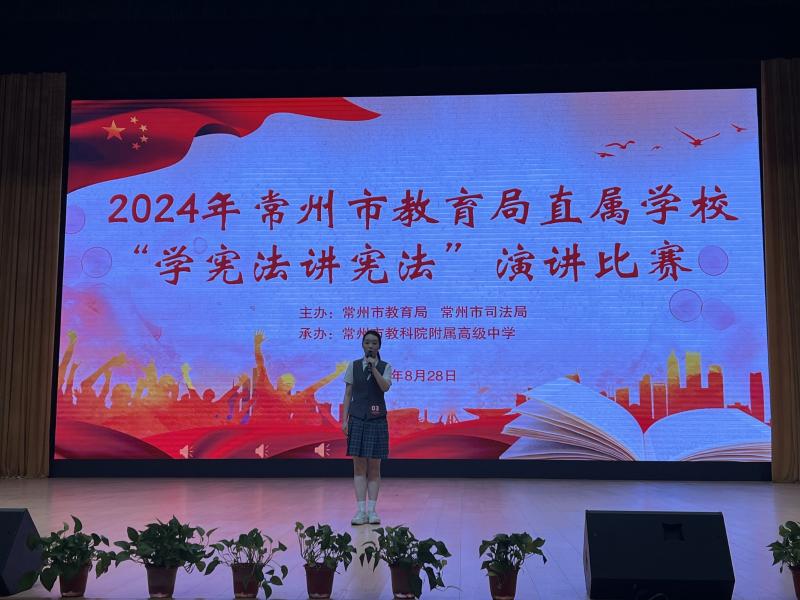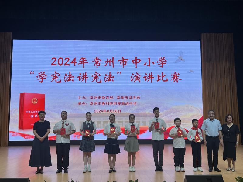 在8月28日举行的常州市中小学2024年度“学宪法讲宪法”活动中我校再次取得佳绩,其中演讲比赛获得常州市(高中组)特等奖第一名、素养竞赛获得常州市(高中组)一等奖、学校荣获优秀组织奖。