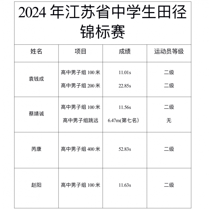 2024年11月2日至3日,由江苏省教育厅、江苏省体育局主办,江苏省学生体育协会、江苏省体育局青少年训练与反兴奋剂管理中心承办,省学生体协中小学校工作委员会、南京大学、南京市第十三中学协办的2024年江苏省中学生田径锦标赛在南京大学仙林校区举行。比赛共设置了100米、200米、跳高、跳远、铅球、标枪等项目,涵盖高中男女两个组别。来自南京、常州、无锡、苏州等172所学校800多名运动员参与这场竞赛。