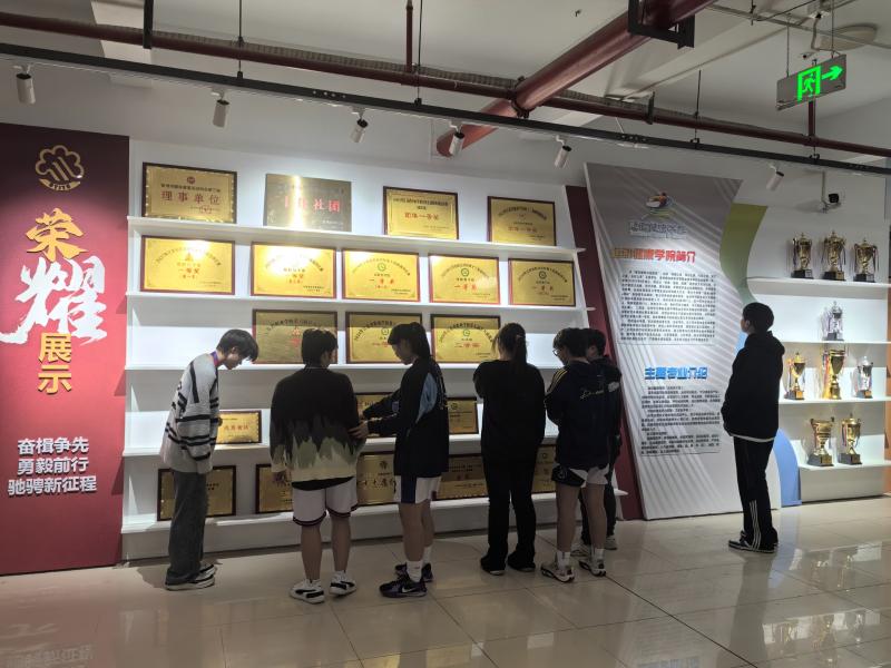 12月10日,运动健康学院体育馆一楼门厅处,学生纷纷围拢在刚完工的的运动健康学院文化墙暨旅商高职校体育荣誉墙处驻足观看,赞叹不已。