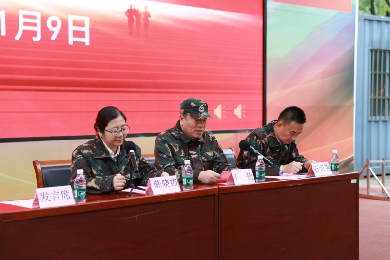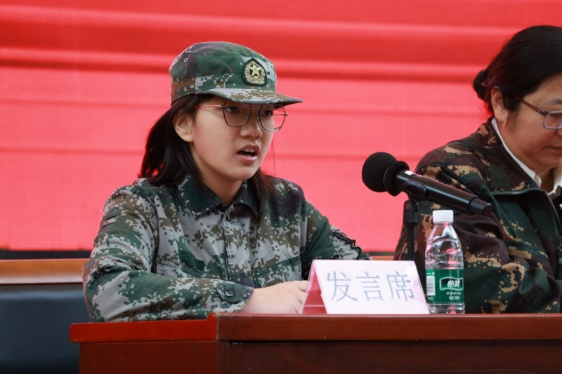 42503班王鑫焱同学代表参训学员发言,她表示将不畏艰难、勤学苦练、挑战自我,以优异的表现交出军训满意答卷。32504班班主任潘娇老师代表军训营指导员发言,她表达了全体班主任老师对同学们的殷切期望与坚定支持,承诺将全力配合教官工作,做好后勤保障与思想引导,陪伴同学们共同完成军训任务。随后,学生发展处处长石荣锦宣读军训营编制人员名单。