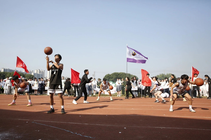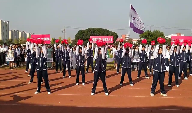 伴随着秋日的微风,所有班级依次入场。他们步履稳健,虎虎生风。看迎面走来的是运动健康系的老师们,他们手持红旗,神采奕奕,引领运健系的同学们向前进发。接着是12201班的入场式。首先是由李皓老师带领七位同学表演的太极拳,一收一放都展现出了太极的刚柔并济。再者是充满力量的五步拳,一招一式处处彰显出磅礴气势。最后是令人目不暇接的花样篮球及由校排球队员展现的扣球技术。12202班紧随其后,他们走出强劲有力的步伐,高声喊出自己的班级口号。随着一声令下,他们散开集合成三个圆形。音乐响起,三组同学搭成基架,三位同学借力迎风而上,展现运健系风采。接着变换队形,有力地挥臂跳跃,创造出独属于他们的色彩。最后进场的是12203班,八位同学挥动红旗向前滑行,分散两队站立。接着三位同学手拿烟雾弹冲刺到位,五位同学运球登场,施朝老师发球,周言同学与其配合击出排球。十九位同学手捧“中国梦”站出八十字样,齐声喊出“五美旅商,动美运健,运体三班,非同一般”后放飞气球完美收官。