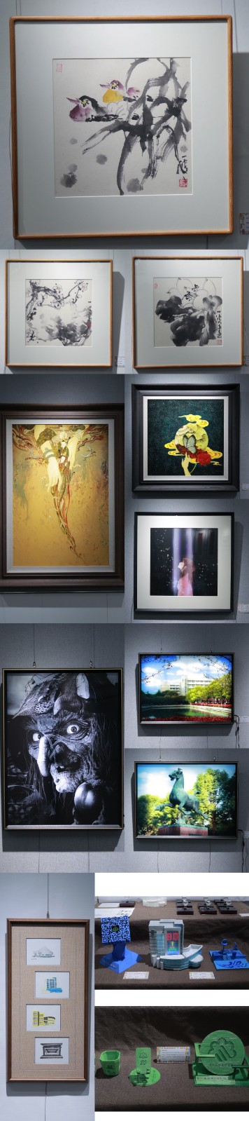 此次作品展展出了来自陈莉、吴姝妍、杨一波、刘陶、汪灵、张艳飞、杨郭彬、严崇军、邱鸿辉、徐嘉忆、杨舒婷、聂凯、刘杨、尤晶晶、潘菡舟、温世桐等16位专业课教师的二十余件作品。作品内容丰富多样,作品表现气象万千,形式涵盖国画、书法、漆画、插画、丙烯装饰画、水粉画、3D裸眼画、系列海报、实体印章、3D打印、三维模型、摄影摄像等多个艺术领域,充分彰显了我系教师扎实的专业基础与匠心独运的创新精神。该展区为师生提供了一个深度对话的平台,让教学与创作之间形成相互映衬的关系。