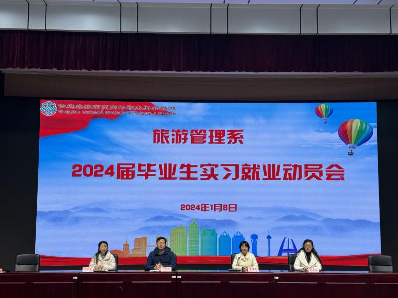 1月8日下午,旅游管理系在季子厅召开了2024届毕业生实习就业动员会,旅游管理系主任史剑锋、学生科长何云霞和综合科长范庆斌出席了此次会议,毕业班班主任和244名高职应届毕业生参加了动员会。会议由旅游管理系副书记王海燕主持。