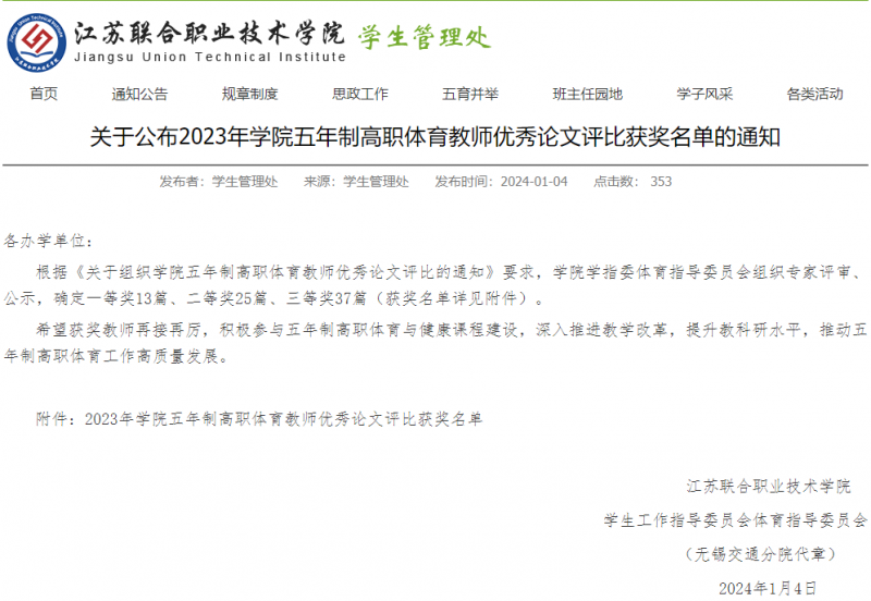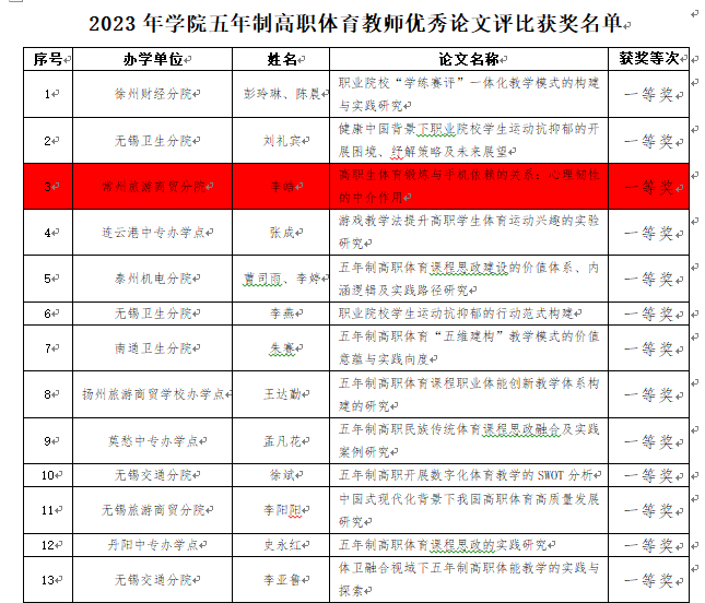 近日,经过江苏联合职业技术学院学指委体育指导委员会组织的专家评审,2023年学院五年制高职体育教师优秀论文评比结果正式揭晓,我系青年教师李皓的论文《高职生体育锻炼与手机依赖的关系:心理韧性的中介作用》荣获优秀论文一等奖,是本次论文评比中常州市唯一的优秀获奖论文。