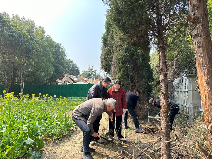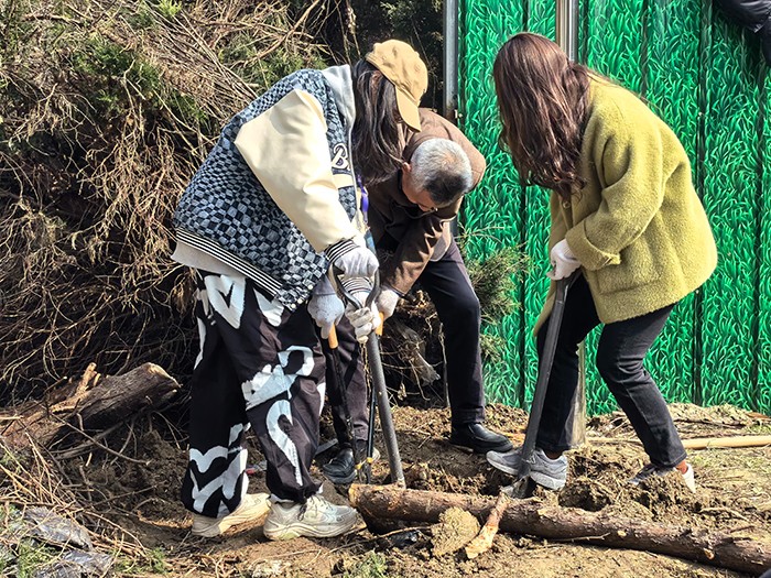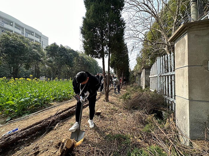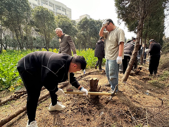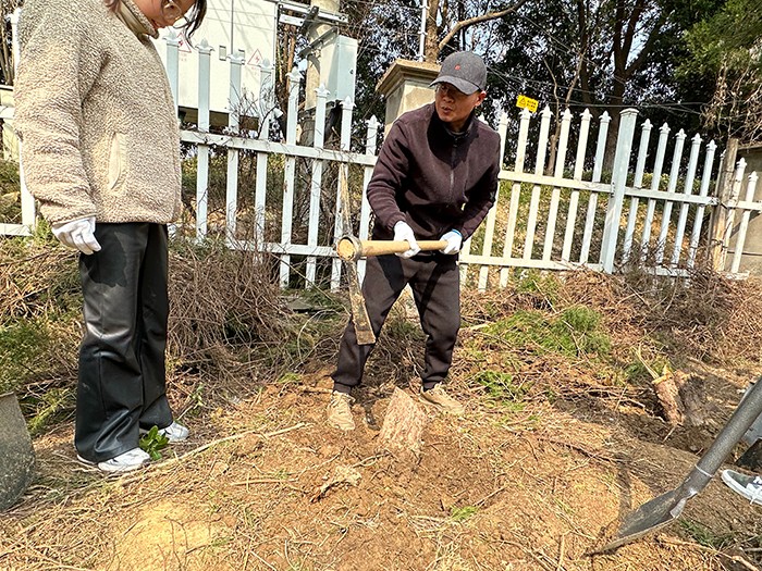 只见清香扑来的油菜花田间,大家热情高涨、干劲十足,无论老师还是学生,都纷纷拿起工具投入到紧张的劳动中。大家使用铁锹、铁镐、剪子、锯子一点一点刨出盘根错节、腐烂坏死的老树根,再在移除的树桩土坑中深挖,并“植”入切割好的多余树干,又挥锹铲土、填平树坑、踩实新土,最后搭立支架,以引导即将种植的藤蔓类植物茁壮成长。