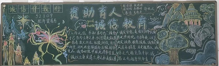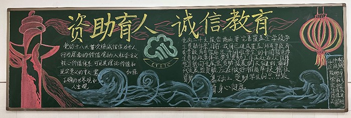 近日,经济贸易系举办了以“资助育人 诚信教育”为主题的黑板报绘制活动。本次活动旨在通过黑板报这一形式,深入宣传资助育人的政策和理念,同时加强学生的诚信教育,营造良好的校园文化氛围。