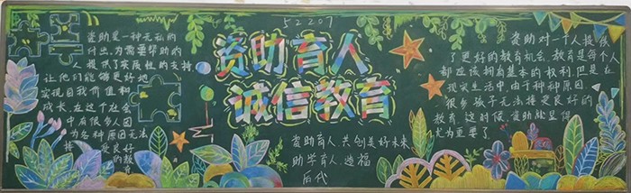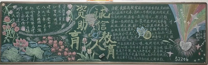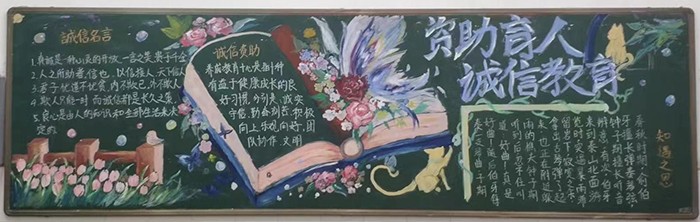 这些黑板报不仅是一种宣传手段,更是同学们自我教育的平台。通过参与黑板报的制作,同学们更加深入地了解了资助育人政策,增强了诚信意识。希望通过这样的活动,同学们能够牢记资助育人的宗旨,树立正确的价值观,以诚信为本,努力学习,为自己的未来奠定坚实的基础。