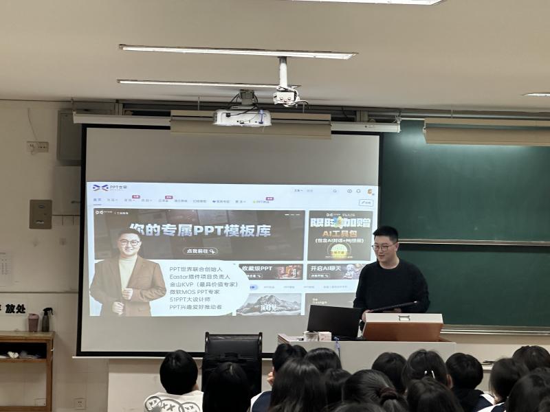 讲座开始前,吴姝妍老师向在场同学介绍了徐安学长在校学习期间获得的各项荣誉,徐安本人用三个词概括了他在PPT领域的奋斗历程:“兴趣启蒙”,“用心极致”和“追求卓越”。从小学时起,他就对PPT产生了浓厚兴趣。来到旅商后,凭借着对专业的热爱选择了创意信息系,更加刻苦地学习这项技能。毕业后,他前往四川成都创业,经历了一路的磨炼,如今已是PPT世界网站联合创始人,其哔哩哔哩网站账号“安逸PPT”也拥有了3.2万的粉丝量,PPT动画、插件教程全网阅读百万,获得了金山最具价值专家KVP称号。