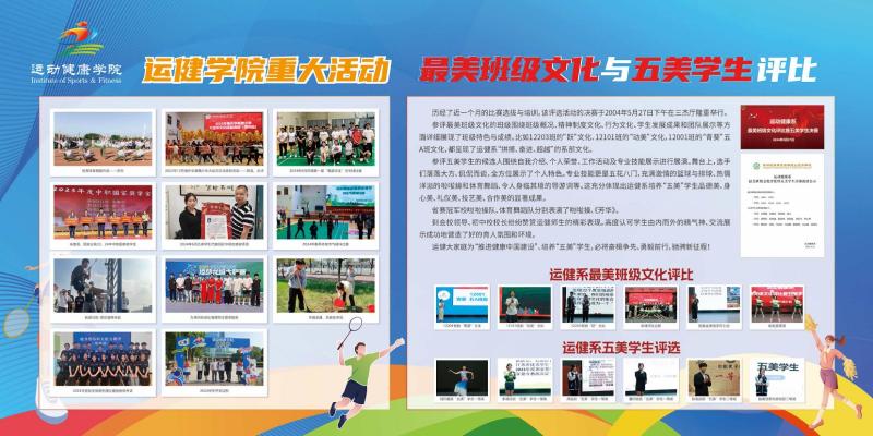 本次布置保留了原2楼连廊的系部介绍、专业介绍、金牌荣誉榜,重点更新了三楼连廊的文化墙布置。内容上重点选取了运健学院最美班级文化评选、运健学院“五美”学生、运健学院“榜样的力量——运动之星”、中国女排精神以及运健学院重大活动作为素材,图文并茂。