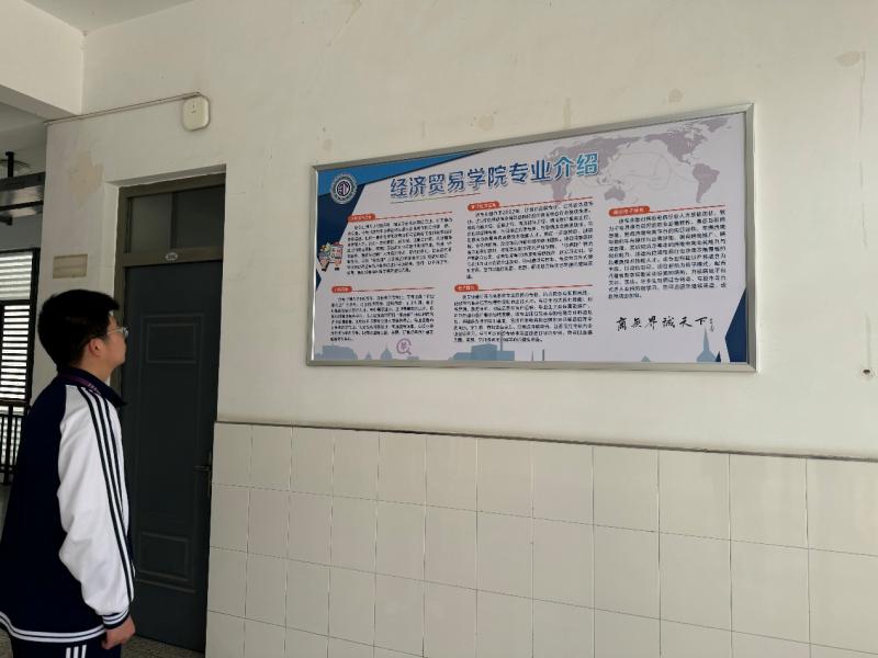 二楼楼梯旁,新增的学院主题背景墙格外引人注目。“经济贸易学院”六个大字庄重醒目,上方院徽熠熠生辉,下方院训“商无界,诚天下”彰显学院精神。整体设计以紫色为主调,既营造出诚信庄重的氛围,又透出现代化商科的独特气息,让每一位学子在潜移默化中增强归属感与文化自信。