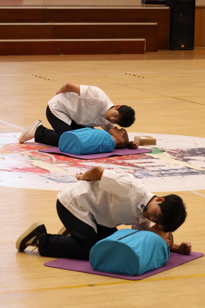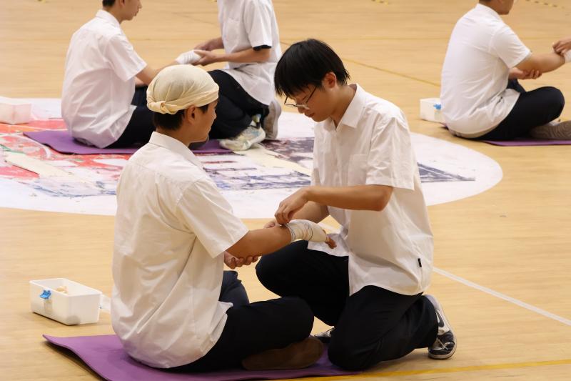 尤其引人注目的是心肺复苏和包扎两项急救技能展示。学生们沉着冷静,严格按照操作规范进行模拟救援,展现了扎实的基本功与应急处理能力。