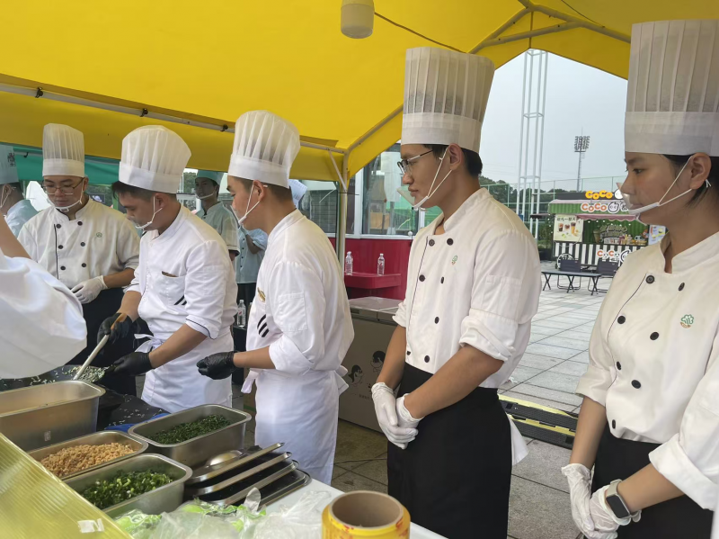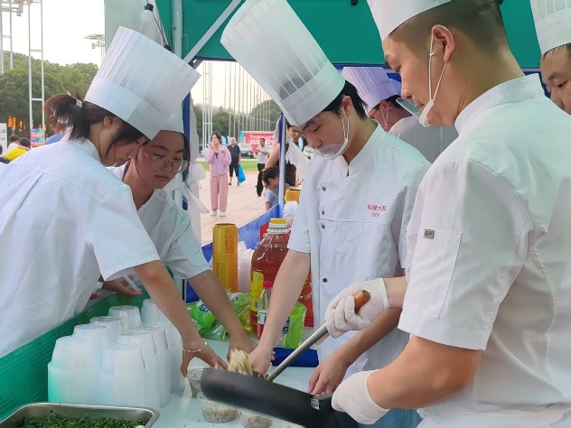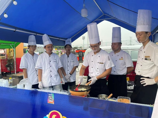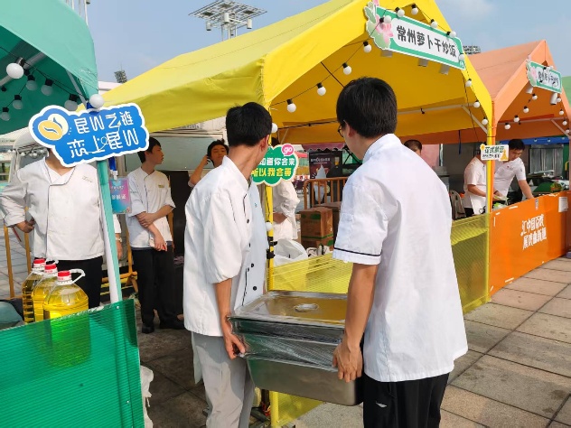 9月28日,酒店烹饪学院副院长田君、常州菜研究院办公室主任张云、学工科长车君艳、烹饪专业教师张家能、李铮、徐超、安康职业技术学院跟岗教师周高娟及25名学生志愿者前往昆山助力苏超常州美食展示活动。活动中聚焦常州经典美食萝卜干炒饭制作,以专业行动传播美食文化,在实践操作与服务活动中锤炼专业技能,彰显酒烹学子的青春风采。