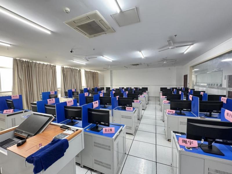 本次考场布置紧扣“公平、规范、严肃”核心原则,全方位筑牢考试保障防线。理论考试区域内,计算机整齐排列,每张计算机桌中间均加装蓝色隔板,隔板高度贴合考试规范。工作人员提前对计算机设备进行调试,确保考试系统稳定运行,同时按座号顺序张贴考生信息,保障入场秩序。