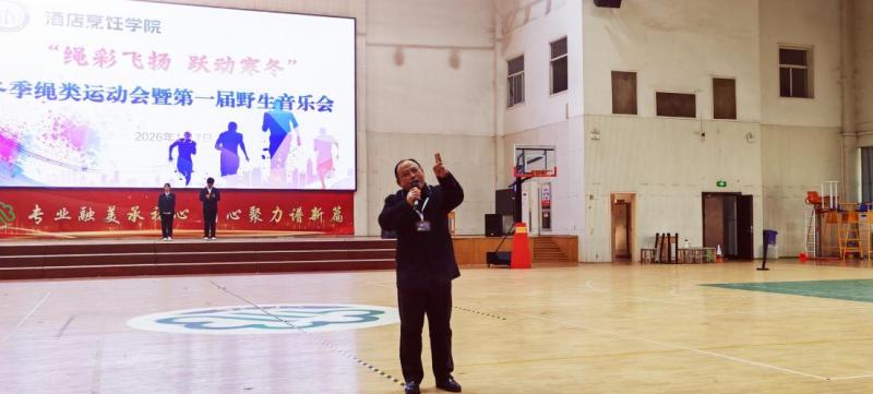 1 月 7 日下午,酒店烹饪学院第二届冬季绳类趣味运动会暨第一届野生音乐会在体育馆正式开幕。副校长戴卫银、学发处处长石荣锦、副处长秦曙、团委科长徐婧熙、酒店烹饪学院副院长王小平、书记王海燕,学院全体班主任出席活动,共同见证这场集竞技趣味与音乐融合的校园盛会。