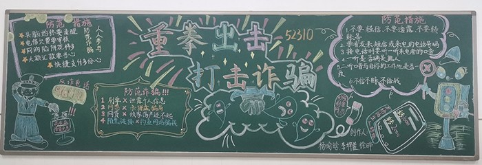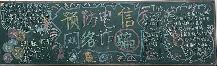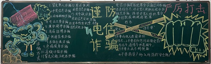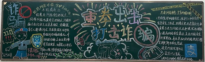 各班同学查阅资料、精心设计,将各种常见的电信网络诈骗手段以及防范措施巧妙地呈现在黑板上。有的班级用形象生动的漫画来揭示诈骗的套路,让同学们一目了然;有的班级则用详实的数据和案例来警醒大家,增强大家的防范意识。