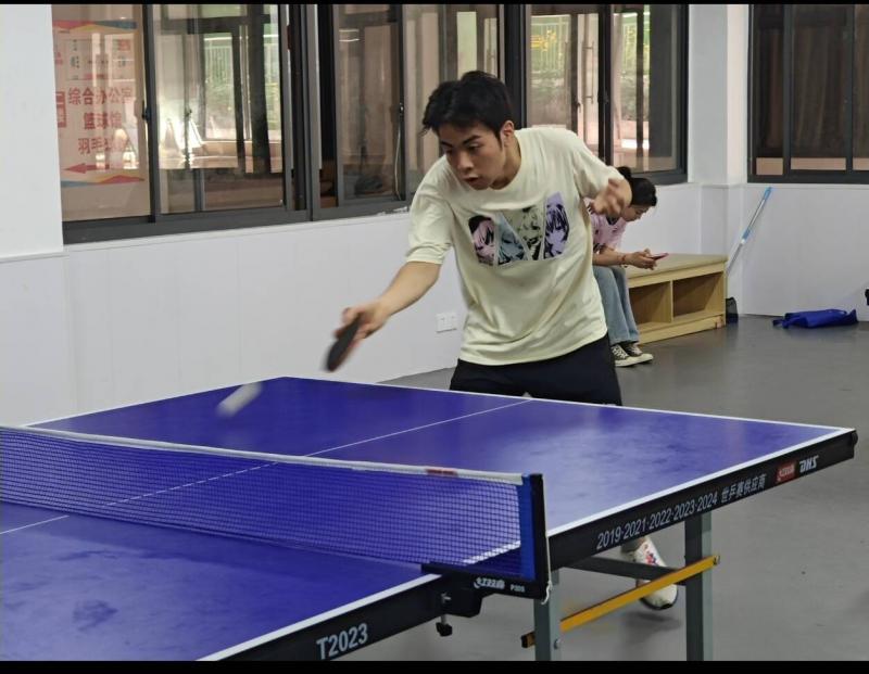 赛场上,王鸿阳同学全神贯注,眼神紧紧跟随飞速跳动的乒乓球。他身姿矫健,步伐灵活,手中的球拍如同一把锐利的武器,挥出的一道道弧线凌厉而精准。每一次发球、接球、扣杀都干净利落,充分展现了其高超的乒乓球技艺以及顽强的拼搏精神。