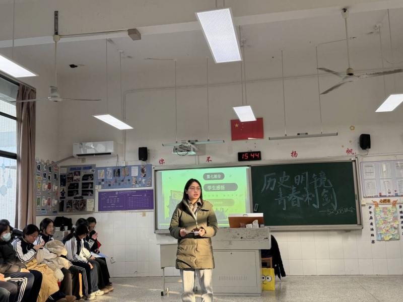 在第三环节“前行·吾辈的思考与担当”环节,学生们纷纷分享感悟与承诺。大家表示,将铭记历史不是延续仇恨,而是以史为鉴,珍惜当下和平。班主任王雨喃老师总结时强调,历史是前行的明灯,青年一代要扛起“珍爱和平、振兴中华”的使命,用青春奋斗书写民族复兴的篇章。班会在歌曲《堕》中落下帷幕,激昂的旋律将爱国情怀与责任担当推向高潮,让铭记与奋起的信念深深扎根在每位学生心中。