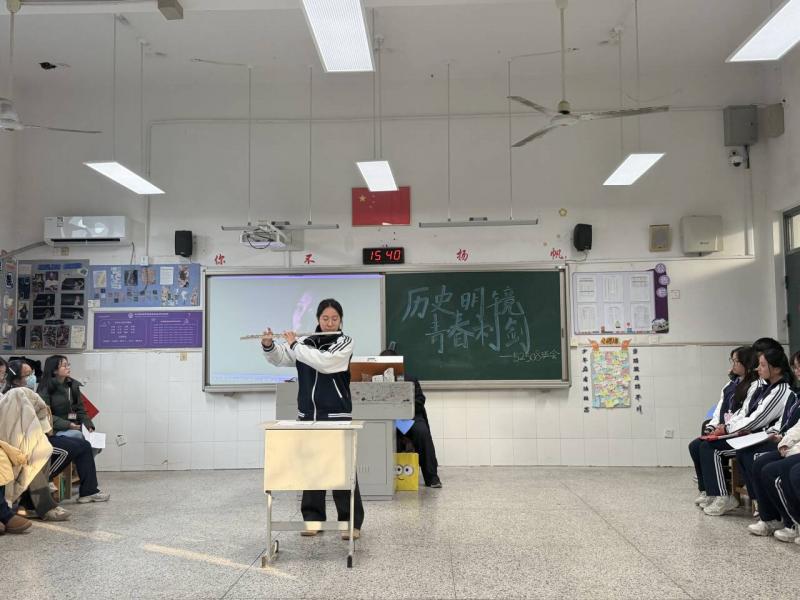 第二环节“不屈·民族的脊梁与祈愿”传递着坚韧与希望。学生齐声朗诵《和平宣言》,铿锵有力的话语回荡在教室,既是对遇难同胞的缅怀,也是对和平的深切祈愿;话剧《明天》生动演绎了不屈的民族魂灵与侵略者的暴戾阴影,演员们真挚的表演让在场师生动容;竹笛独奏《如愿》再次奏响,悠扬笛声穿越时空,告慰山河与先烈。