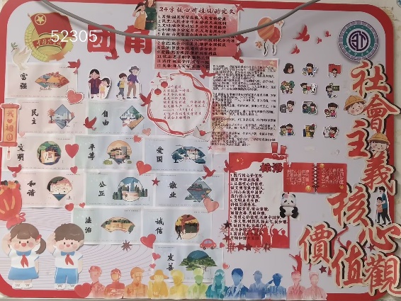 走进教室,主题鲜明、设计新颖的团角格外引人注目。有的班级以图文并茂的形式展现核心词内涵,有的班级以鲜活案例传递正能量,充分展现了同学们对核心价值观的深刻理解与创新表达。52206班以剪纸艺术为载体,将社会主义核心价值观二十四个字对应的场景生动呈现,用传统技艺诠释时代精神。52307班与52403班则精选《人民日报》等权威媒体的相关报道,深入理解核心价值观的内涵与时代意义。